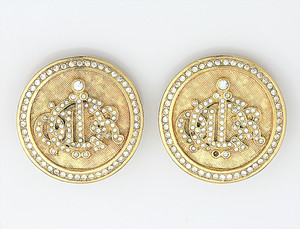 Ohrclips von CHRISTIAN DIOR (signiert), vergoldetes Metall mit Strasssteinen, Guillochenuntergrunddruck, D = 37,5 mm
