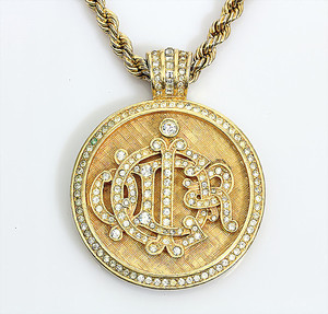 Kette mit Anhänger von CHRISTIAN DIOR (signiert), vergoldetes Metall mit Strasssteinen, Guillochenuntergrunddruck, D = 50,5 mm, L = 88 cm