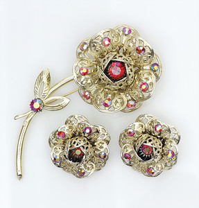Set: a.) Goldfarbene Ohrclips in Form von Blüten von Sarah Coventry. Mit roten, AB-bedampften Steinen. Passende Brosche in Form einer Blume. D = 43,5 mm