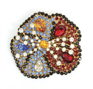 Große Strassbrosche in abstrakter Blütenform, signiert ESCADA in Rot, Blau und Orange sowie klaren und dunklen Strasssteinen. 88,5 x 81 mm