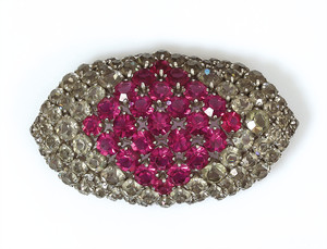 Große Strass-Brosche von Dior (signiert Chr. Dior 1961). Einzeln gefasste Strasssteine in Pink (in der Mitte als Raute angeordnet) und Rauchquarzfarben,ca. 46,5 x 44,5 mm