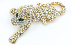Goldfarbene Brosch unsigniert. Klarer Strassbesatz. Plastische Darstellung eines Tigers. Ähnlich wie TRIFARI, ca. 83,5 x 35,5 mm