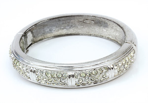 Silberfarbene Armspange von Grosse (signiert Grossé). Auf der Vorderseite üppig besetzt mit klarem Strass. D innen = 56,5 x 53,0 mm
