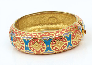 Goldfarbene Armspange mit Emaille-Auflage von Joan Rivers (signiert). Korall- und türkisfarbenes orientalisches Muster. D innen = 57,5 x 51 mm