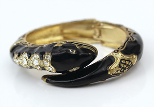 Unsignierte Schlangen-Armspange. Schwarze Emaille-Auflage. Goldfarben abgesetzt. Verziert mit klaren Strassteinen. D innen = 56 x 47,5 mm