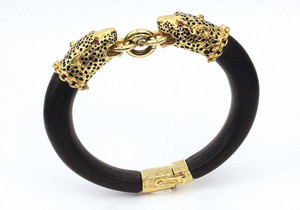 Exklusive Armspange von Franklin Mint 1987 (signiert FM 1987) mit 2 Panther-Köpfen. Eine Kopie des prunkvollen Armreifens der Herzogin von Windsor. Die Augen der Panther sind mit rubinfarbenen Steinen besetzt. Die Pantherköpfe, die Ringe bzw. Zwischenelemente sind vergoldet mit 22K. Der Reif selbst ist aus fast schwarzem Ebenholz. Im Originalkarton. D innen = 66,5 x 55 mm