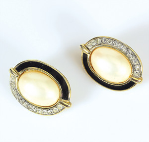 Ovale Perlen-Ohrclips (signiert Trifari). Je eine Kunstperle zur Hälfte mit einem schwarzen Emaille-Rand und zur anderen Hälfte mit klarem Strassbesatz. 28 x 19 mm