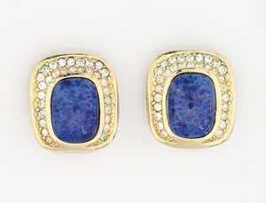 Goldfarbene Ohrclips von Grosse, Pforzheim (signiert Grossé). Rechteckige Form, in der Mitte blau-marmorierter Kunststein, an 3 Seiten umringt von klaren Strasssteinchen. 21,5 x 19,5 mm