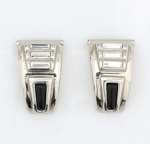 Große, silberfarbene Ohrclips von DIOR. Schwarze Einlage, je 3 längliche, geschliffene Strasssteine. H = 35 mm