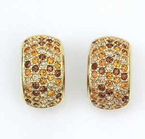 Goldfarbene Ohrclips von Grossé (signiert). Halbcreolen mit Strasssteinchen in orange- und Brauntönen. H = 20,5 mm