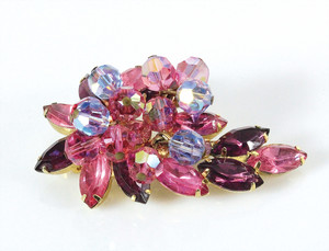 Strass Brosche (unsigniert) mit Strasssteinen und frei beweglichen Kristallperlen in Rosa und Violett. Hochwertiger Modeschmuck aus den USA. 60er Jahre. 60 x 39 mm