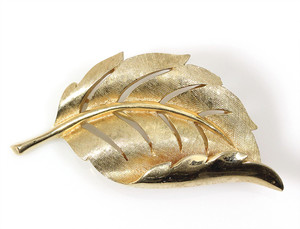 Klassische Blatt-Brosche von Trifari. Goldfarben, plastische Gestaltung mit matter und glänzender Oberfläche. L = 53,5 mm