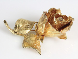 Goldfarbene Brosche in Form einer plastischen Rose. Grosse Pforzheim (signiert Grosse - Germany – 1967). L = 65,5 mm