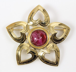 Goldfarbene Stern-Brosche von Dior (signiert). Roter runder Glascabochon umringt von goldfarbenen Herzen. D = 55 mm