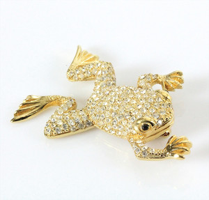 Goldfarbene Frosch-Brosche von DIOR. Reichlich besetzt mit klarem Pavé-Strass. 50 x 31 mm