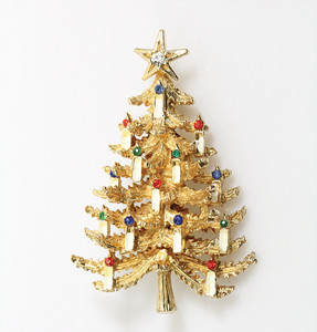 Weihnachtsbaum-Brosche, goldfarben, signiert ART; winzige bunte Strasssteine; weiß emaillierte „Kerzen“. H = 28,5 mm