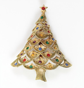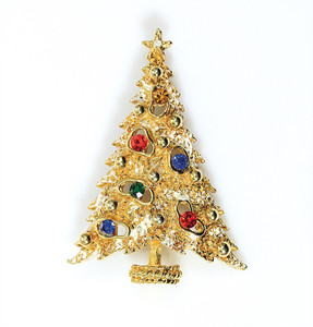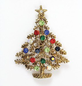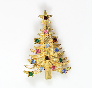 Weihnachtsbaum-Brosche, matt goldfarben, signiert ART; unterschiedlich farbige Strasssteine. Leichte weiße Emaille-Auflage als „Schnee-Imitation“. H = 22,5 mm