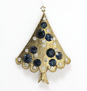 Weihnachtsbaum-Brosche, goldfarben, signiert WEISS; dunkelblaue und klare Strasssteine in unterschiedlichen Größen. H = 62,5 mm