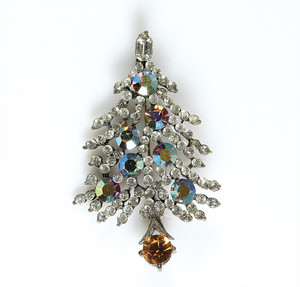 Weihnachtsbaum-Brosche, silberfarben, signiert LISNER; kleine, klare und größere topazfarbene Strasssteine. H = 59,5 mm