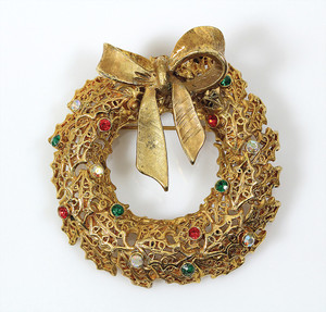 Weihnachtskranz-Brosche von TANCER. Filigranes Oberflächenmuster. Unterschiedlich farbige Strasssteinchen. Goldfarbene Schleife. D = 51 mm