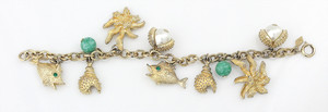 Bettelarmband von Sarah Coventry (signiert Sarah Cov.). Maritime Anhänger (Fische, Muscheln, Algen etc.). Goldfarben mit grünen Akzenten und 2 Kunstperlen.L = 18,0 cm