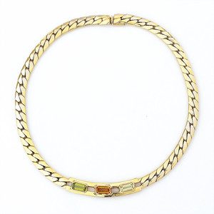Goldfarbenes Collier von Vogue Bijoux (signiert). Glänzende Schlangenkette mit Mittelteil, besetzt mit 3 rechteckigen, geschliffenen Steinen in zarten Grün- und Orangetönen.L = ca. 39 cm
