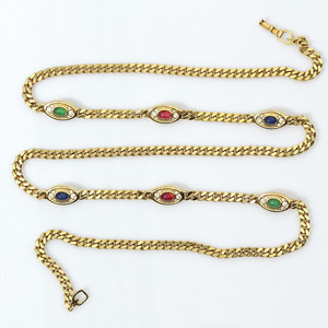 Lange Gliederkette von Grosse, Pforzheim (signiert Grossé) mit 6 beidseitig besetzten, ovalen Zwischenteilen mit farbigen Glascabochons und winzigen, klaren Strasssteinen. L = ca. 83 cm
