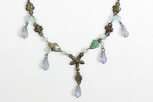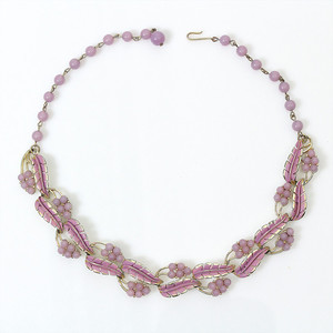 Zart-violettes Collier von CORO, USA (signiert). Emaillierte Blätter und violette Glasperlchen. Goldfarbene Fassung. L = ca. 42 cm