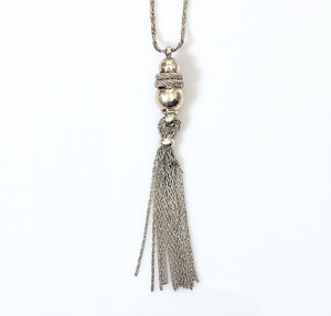 Lange silberfarbene Schlangenkette mit langem „Tassel-Anhänger“ (Abhängung mit 14 Kettensträngen) signiert Grossé (Henkel & Grosse, Pforzheim). L = ca. 81 cm