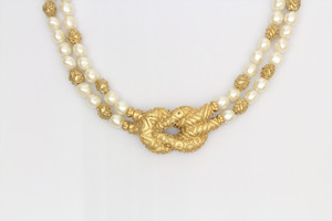 Zweireihiges Kunstperlen-Collier von Franklin Mint im Originalkarton. „Etruskisches Collier“. Vergoldete Zwischenteile und Mittelteil in Form eines Knotens. L = ca. 46 cm
