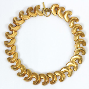 Goldfarbenes Collier von Anne Klein (USA). Schwere Qualität. Matte Oberfläche, halbmondförmige Kettenglieder. L = ca. 45 cm