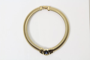 Goldfarbenes Halsband von Grosse Pforzheim (signiert Grossé). Glänzende Oberfläche, in der Mitte ein gefasster, geschliffener Glasstein in blau. L = ca. 44 cm