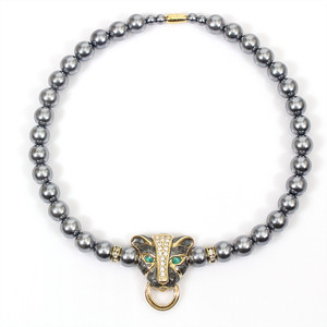 Panther-Collier signiert KJL for AVON (Kenneth Jay Lane). Anthrazitfarbene Kunstperlen; in der Mitte ein emaillierter, strassbesetzter Pantherkopf. L = ca. 45,5 cm