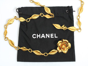 Metallgürtel mit Rose von CHANEL im Original-Staubbeutel. Mit CC-Anhänger und einer Signatur auf dem letzten Kettenglied. Kettenglieder in plastischer Blätter-Form. Hakenverschluss rückseitig an der ebenfalls plastisch gestalteten Rose. L = ca. 91 cm