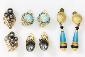 Lot: 4 Paar Ohrclips ( 1 x Hänger), 2.te Hälfte 20.tes Jhd., Metall vergoldet, Straß, Glas (Türkisimitation), Onyx
