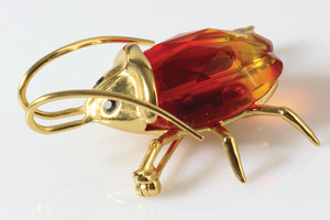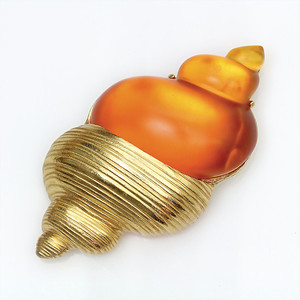 Große, massive Designerbrosche von Dior um 1970, karneolfarbiger Kunststein, goldfarbenes Metall in Form einer großen Muschel, im Originalkarton, 98 x 51,5 mm