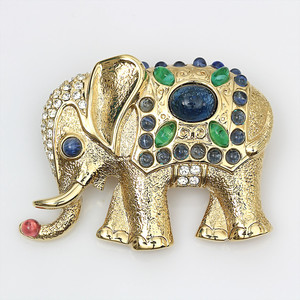 Figürliche Brosche von Grossse (Henkel & Grosse, Pforzheim), in Form eines Elefanten, besetzt mit klaren Strasssteinen und farbigen Glascabochons, in Blau-und Grüntönen, 54,5 x 41,5 mm