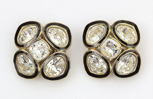 Große goldfarbene Ohrclips von Christian Dior (signiert), je 5 geschliffene klare Strasssteine umrandet mit schwarzer Emaille, D = 31,5 mm