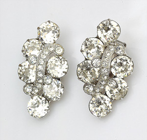 Silberfarbene Ohrclips von Eisenberg ( signiert), USA, 50er Jahre, große u, kleine gefasste Strasssteine, klar und funkelnd, H =37 mm