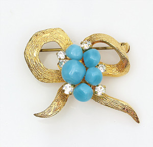 Schleifenbrosche von Dior (signiert mit der Jahreszahl 1967), türkisfarbene Glasperlchen und 6 klare Strasssteine, 38 x 32,5 mm