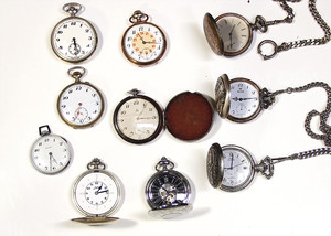 Lot: 10 Taschenuhren u.a Junghans Blindenuhr; Alpina, Art-Deco Silber 900/000; Trumpf Stahl; Feldmann Fero mit Uhrenkette; Favor u.a, alle Uhren laufen !!