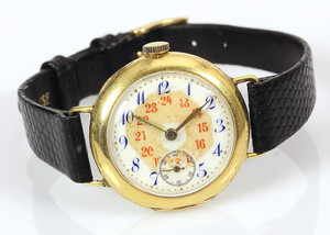 Damenarmbanduhr, (umgearbeitete Taschenuhr), GG 750/000, E.Z.Blatt mit farbig abgesetzten arab. Zahlen, kl. Sekunde auf 6 Uhr, D = 26,5 mm, Eidechsenband, Uhr läuft