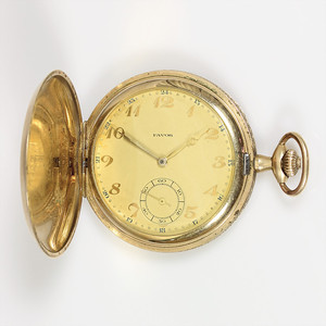 Herrentaschenuhr, FAVOR, ART-DECO 20.Jahre, Walzdouble, Sprungdecke, arab. Zahlen, kl. Sek. auf 6 Uhr, Ankerhemmung, Brequetspirale, D = 50,5 mm, Monogramm F.G., Uhr läuft