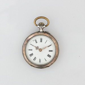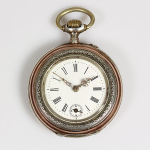 Zylinder-Herrentaschenuhr, FRITZ REMETTER, Mainz um 1900, Silber 800/000, E.Z.Blatt mit röm. Zahlen, fein gearbeitete Zeiger, Minutenpunkte goldfarben abgesetzt, kl. Sek. auf 6 Uhr, Gehäuse kupferfarben abgesetzt, Glas wurde ersetzt, D = 47 mm, Uhr läuft