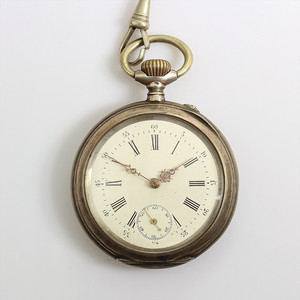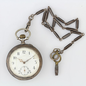 Herren-Zylindertaschenuhr 10 Rubine, Silber 800/000, sehr gut erhaltenes E.Z.-Blatt, röm Index (Std.), arab. Zahlen (Minuten), filigrane Zeiger mit 1 Diamanten, kl. Sekunde auf 6 Uhr, Z.B. = Metall, hinten graviert, D = 38,5 mm, Uhrenkette Metall, Uhr läuft ab (nicht in jeder Lage!)