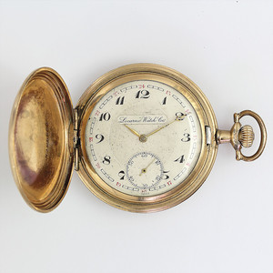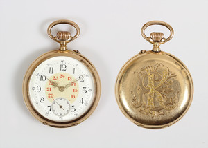 Herren-Taschenuhr um1905, GG 585/000, E.Z. Blatt sehr guter Zustand, Zeiger Louis 15, rot u. schwarz abgesetzte arab. Zahlen ( 24 Std. Abziehbild), kl. Sekunde auf 6 Uhr, Vollankerwerk mit 15 Rubinen, (3 Chatons), Brequetspirale, Z.B.Metall, Kronenaufzug, Rückseite graviert: "EK" D = 49,5mm, Uhr läuft