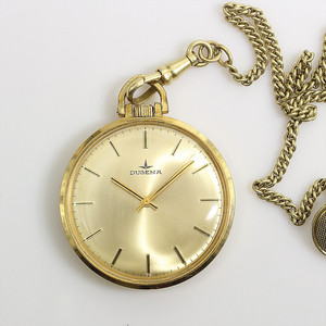 Herren-Taschenuhr, DUGENA, Zentralsekunde, Strichindex, Handaufzug, D = 39 mm, Uhrenkette, GG 585/000 25 cm, Knopf u. Karabiener, RV, Gravur: Zum 65. Von allen Kollegen der Teutonia, Uhr läuft