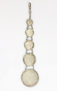 Trachtenschmuck-Uhrenkette, CHATELAINE 40Jahre, Silber, Münzen der Königin Wilhelmina ( Königin der Niederlande),am Enden Karabiner zum Aufhängen, H 17,5cm, total 48 g