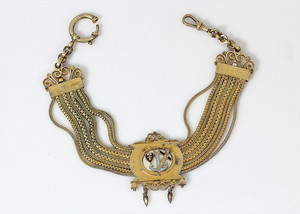 Trachtenschmuck-Uhrenkette, CHATELAINE um 1900 in sehr guter Qualität, Silber vergoldet, Mittelteil mit emaillierten Symbolen für Glaube, Liebe u. Hoffnug (Hintergrund aus Perlmut). Das Mittelteil ist als Schieber gearbeitet, an den Enden befindet sich ein Karabiner u. ein Federring, L = 30,5 cm