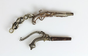 Lot: 2 Taschenuhrenschlüssel in Form einer Pistole, Silber (Eisen), L = 41 -41,5 mm (ohne Kette)